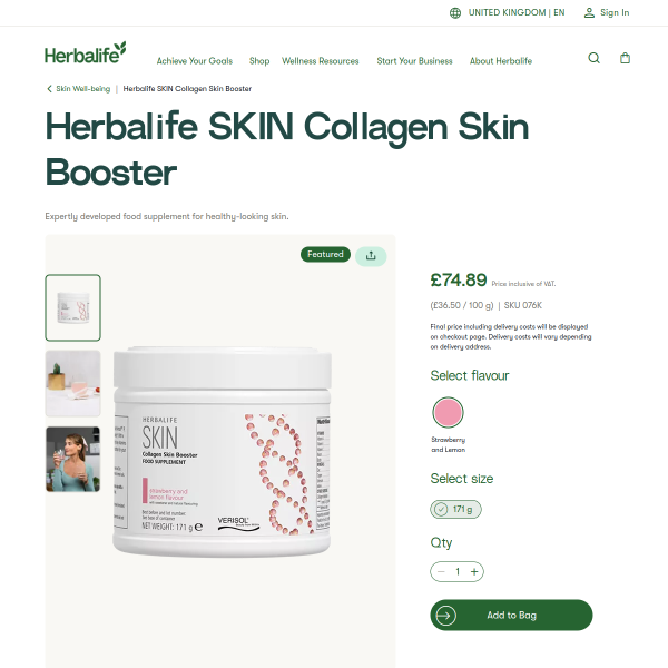 Herbalife Collagen Skin Booster focuses on nourishing skin from within delivering Verisol® P collagen peptides in a refreshing Strawberry & Lemon flavour